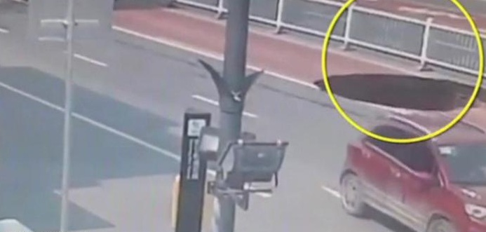 وظهرت الحافلة وهي تسير على طريق مخصص لسير المركبات الكبيرة، في مقاطعة غوانغسي، قبل أن تظهر حفرة عرضها 3 أمتار وعمقها 3 أمتار، بعد مرورها بلحظات.