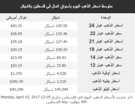 رام الله - الاقتصادي - جاءت اسعار الذهب في فلسطين لعيارات 18، 21 ، 22 ،24 في الاسواق المحلية على النحو التالي :-