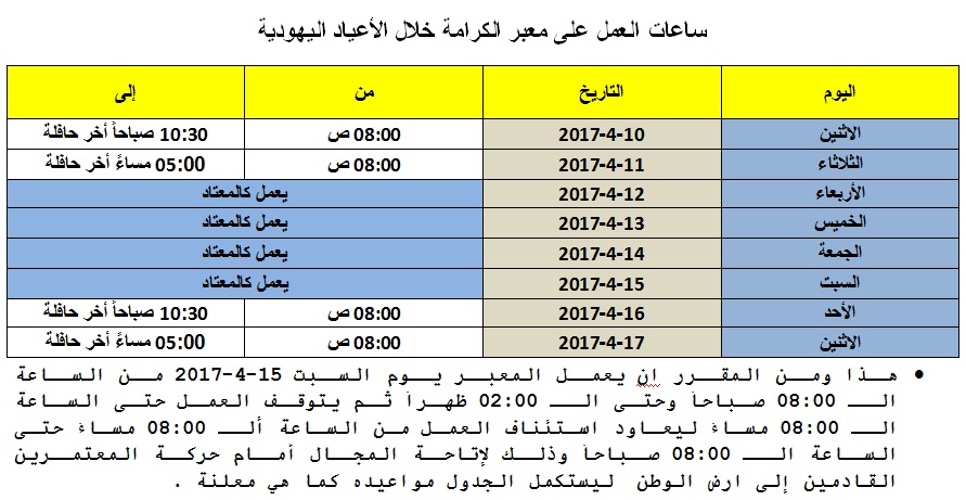 وسيعاود المعبر العمل من الساعة الثامنة صباحا حتى العاشرة صباحاً يوم الاحد 16.4.2017 ويوم الاثنين 17-4-2017 سيعمل من الساعة الثامنة صباحا حتى الخامسة وذلك بسبب الاعياد اليهودية.