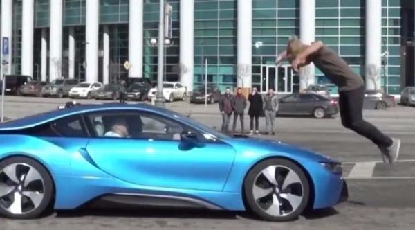 وما هي إلا لحظات، وعلى بعد أمتار قليلة من السيارة، حتى قفز أوليج وأدى حركة شقلبة بهلوانية في الهواء من فوق السيارة، قبل أن يتخطاها وينزل على قدميه بثبات مدهش، بحسب ما أوردت صحيفة ميرور البريطانية.