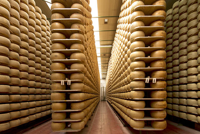 بنك كريديتو اميليانو الذي يمتلك مئات الفروع وآلاف الموظفين في جميع أنحاء وسط وشمال إيطاليا قام بتجهيز مكاتبه لتبدو كأية مؤسسة مصرفية أخرى بأحدث الكاميرات في جميع الزوايا وتأمين الأبواب، وإذا ما وصلت للجزء الخلفي فلن تجد الماس أو العملة الصعبة المخزنة هناك، وإنما هناك مئات الآلاف من “بارميجيانو ريجيانو” (عجلات الجبن) وضعت بعناية على الرفوف العملاقة.