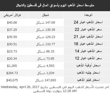 رام الله - الاقتصادي - جاءت اسعار غرام الذهب في الاسواق الفلسطينية اليوم الاربعاء، لعيارات 18.21.22.24 على النحو التالي:-
