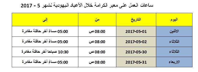 رام الله - الاقتصادي - أعلن نظمي مهنا مدير عام الادارة العامة للمعابر والحدود في السلطة الفلسطينية، اليوم الأربعاء، عن إجراء تعديل في ساعات عمل معبر الكرامة خلال شهر ايار المقبل وذلك بسبب الاعياد اليهودية.