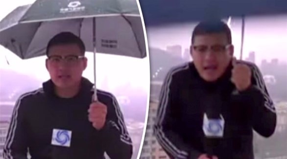 ويظهر الفيديو الصادم، المراسل ليو سياودونغ وهو يحمل مظلته ويقدم تقريره عن الطقس العاصف لمحطة تلفزيونية صينية، قبل أن تباغته صاعقة قوية وتضرب القطعة المعدنية في أعلى مظلته.