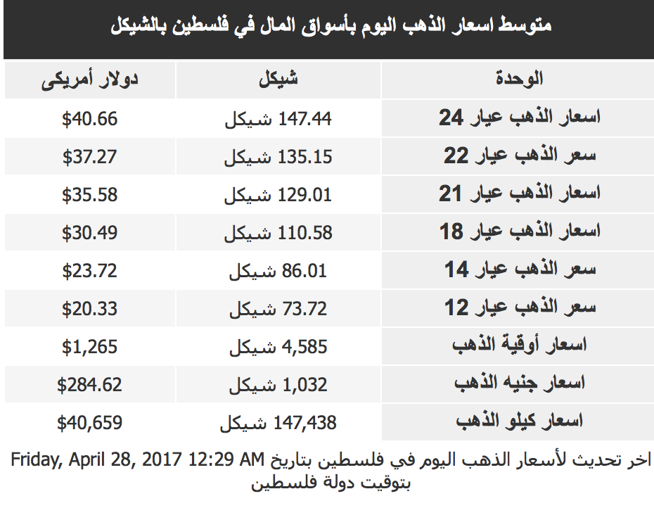 رام الله - الاقتصادي - جاءت اسعار غرام الذهب اليوم الجمعة المباعة في الاسواق الفلسطينية لعيارات 18.21.22.24 على النحو التالي: