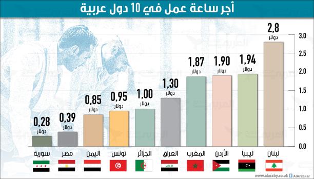 بحسب القوانين اللبنانية، فإن الحد الأدنى للأجور وصل إلى نحو 450 دولاراً، ما يعني أن العامل اللبناني يتقاضى 2.8 دولار في الساعة الواحدة.