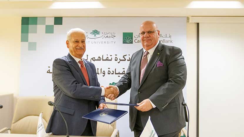 ووقع الاتفاقية رئيس الجامعة د. عبد اللطيف أبو حجلة ونائب المدير العام، المدير الإقليمي لبنك القاهرة عمان السيد جوزيف نسناس.