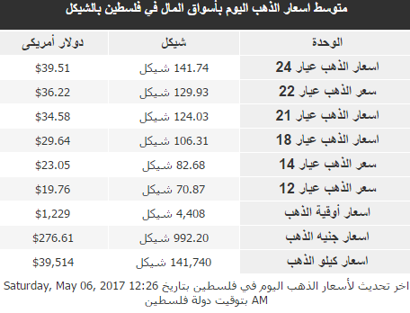 رام الله - الاقتصادي - جاءت اسعار غرام الذهب في الاسواق الفلسطينية، اليوم السبت ، لعيارات 18.21.22.24 على النحو التالي :_