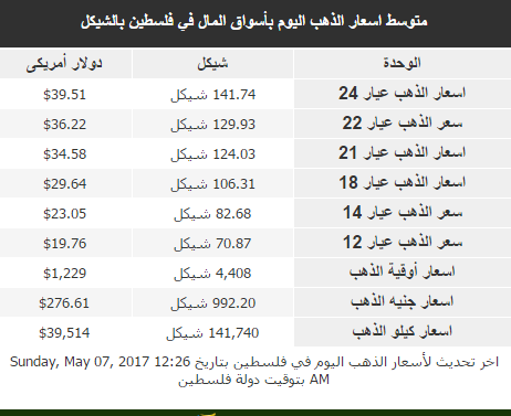 رام الله - الاقتصادي- جاءت اسعار غرام الذهب في الاسواق المحلية الفلسطينية، اليوم الاحد، لعيارات 18.21.22.24 على النحو التالي:-