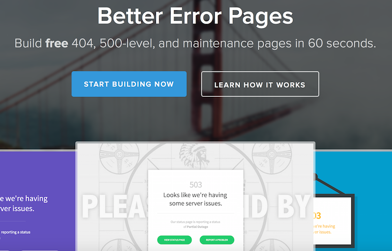 موقع StatusPage.io يقدم أداةً مجانية تُدعى Better Error Pages، والتي تهتم بتقديم طريقة بسيطة وعملية لتصميم صفحات الخطأ، وذلك عن طريق اختيار أحد القوالب المتاحة ضمن الأداة، ومن ثم تطويرها فيما يتناسب مع موقع المستخدم.