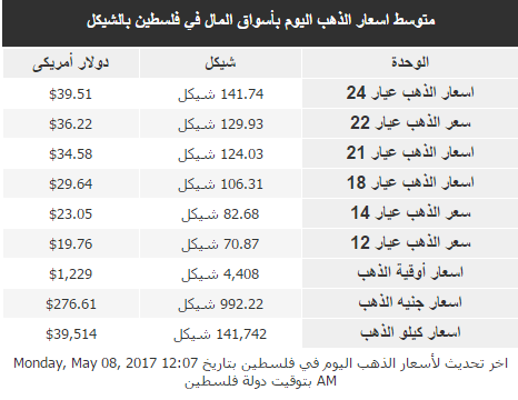 اسعار الذهب اليوم في فلسطين