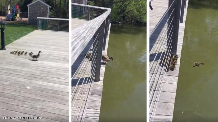 وتمشي البطة أمام صغارها على جسر خشبي فوق بحيرة إلى حين وصولها إلى الحافة، وبعد ذلك تقفز ثم تنتظر صغارها الذين يبدأون بالقفز في الماء واحدا تلو الآخر في مشهد لطيف.