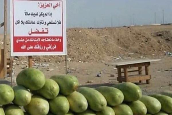 وعلق لافتة جوار بضاعته المعروضة كتب عليها: "إذا لم يكن لديك مالًا فلا تستحي وتترك عائلتك بلا أكل.. تفضل وخذ ما تحتاجه، فرزقي ورزقك على الله".