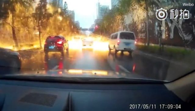 وبدأت الشوارع تمطر "نارًا" لمدة ثوانى معدودة كما ظهر فى الفيديو، وتضىء الشوارع ليلا لمدة نصف ساعة، وضربت الصاعقة الأشجار على جانبي الطريق، ما نتج عنها انفجار شديد.