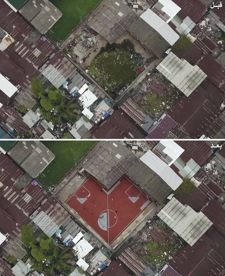 لذلك، قام AP THAILAND بمساعدة شركة الوكالة الرقمية في تايلاند “سغ وورك” بإخلاء بعض المساحات الصغيرة التي عُثر عليها وإعادة تطويرها لتكون ملاعب كرة قدم لكنها تفتقر للتناظر.