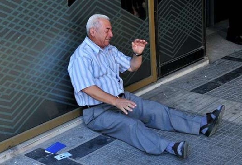والتقط مصور وكالة فرانس برس صورة هذا الرجل وهو يجلس خارج البنك وينتحب بيأس وقد وضع دفتر المدخرات وبطاقة الهوية على الارض. ولخصت الصورة معاناة المواطنين اليونانيين اليومية خلال ازمة الديون التي تعاني منها البلاد.وفرضت السلطات اليونانية قيودا على حركة الاموال واغلقت جميع البنوك منذ يوم الاثنين لمنع سحب مبالغ كبيرة من البنوك، ولكنها سمحت الاربعاء بفتح بعض الفروع لمدة ثلاثة ايام حتى يتسنى للمتقاعدين الذين ليست لديهم بطاقات مصرفية سحب معاشاتهم التقاعدية بمبلغ اقصى هو 120 يورو.وروى حجي فوتياديس كيف انه زار مصرفا بعد الاخر في محاولة فاشلة للحصول على المعاش التقاعدي لزوجته، وقال انه "عندما قال له البنك الرابع انني لا استطيع ان احصل على المبلغ، اصبت بالانهيار".