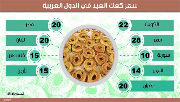تختلف أسعار كعك العيد بين دولة وأخرى، في قطر يباع الكيلوغرام من كعك العيد، أو المعمول بسعر 20 دولاراً، فيما يرتفع السعر قليلاً في الكويت ويباع بـ22 دولاراً.