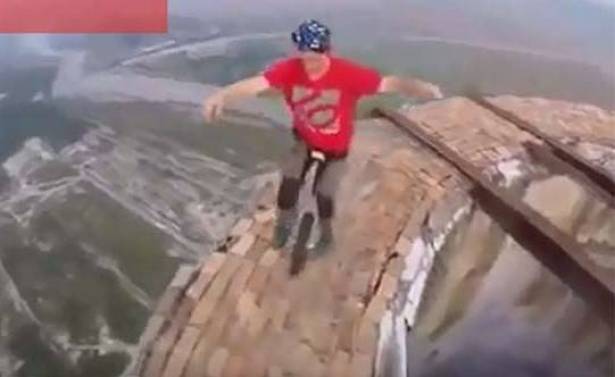 بالفيديو: لحظات تخطف الأنفاس.. شاب يقود عجلة فوق حافة!