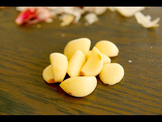 1- توضع فصوص الثوم على لوح التقطيع، ويضغط عليها باستخدام سكين عريضة بكف اليد، فتنفصل القشرة عن فصوص الثوم بسهولة.