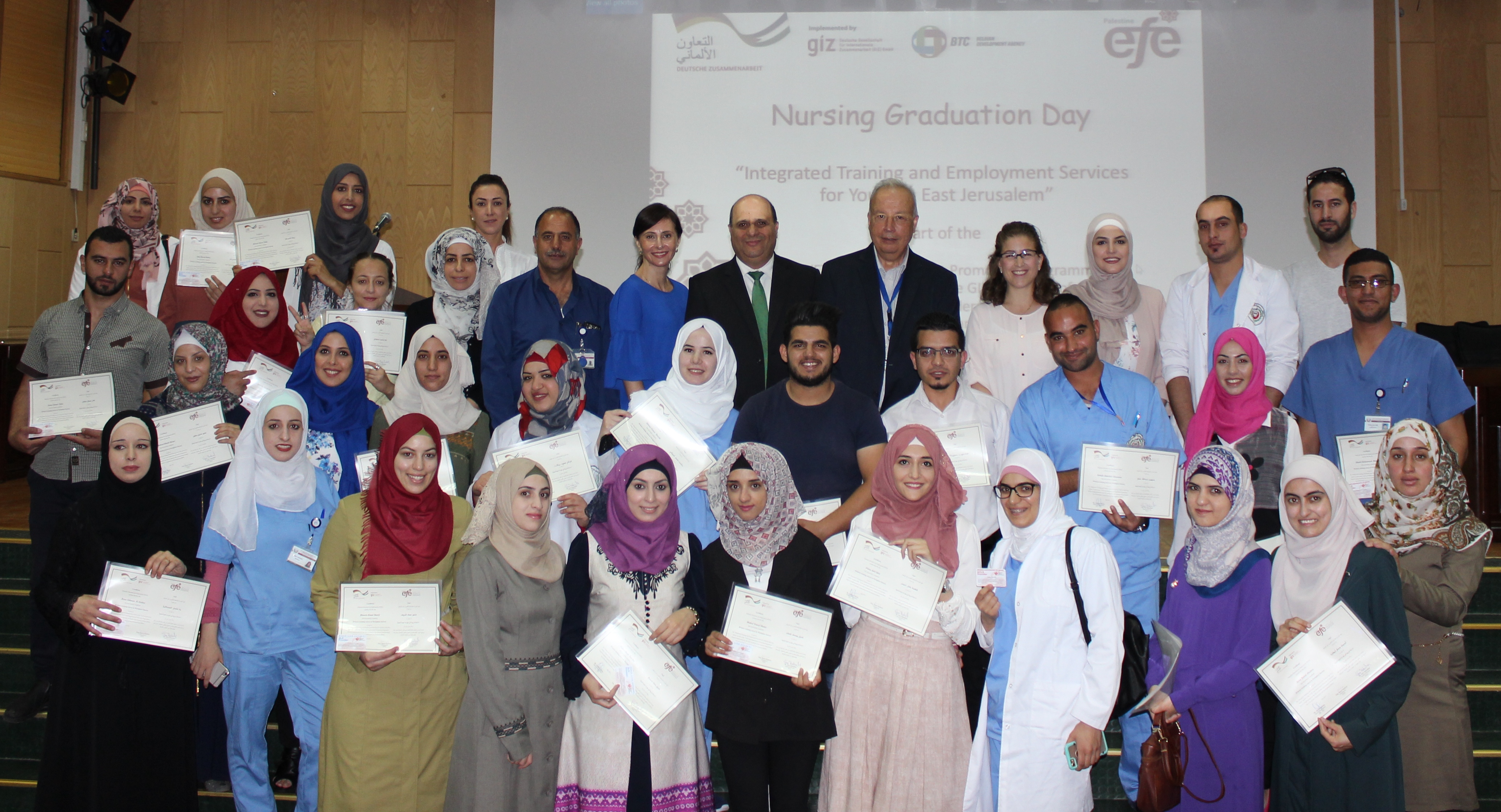القدس - الاقتصادي - احتفلت المؤسسة الفلسطينية للتعليم من أجل التوظيف بتخريج 51 من الممرضين والممرضات المقدسيين، بعد اتمامهم تدريبا فنياً متخصصاً في مجال التمريض، 90% منهم تم ربطهم في مستشفيات ومراكز صحية مختلفة. وتم تنفيذ التدريب ضمن مشروع "خدمات تدريب وتشغيل متكاملة للشباب في القدس" الذي تنفذه المؤسسة بالشراكة مع شبكة مستشفيات القدس ومؤسسة جذور، ويأتي هذا المشروع ضمن إطار برنامج "تعزيز التعليم والتدريب المهني والتقني والتشغيل" الذي تنفذه GIZ بالنيابة عن الحكومة الألمانية.