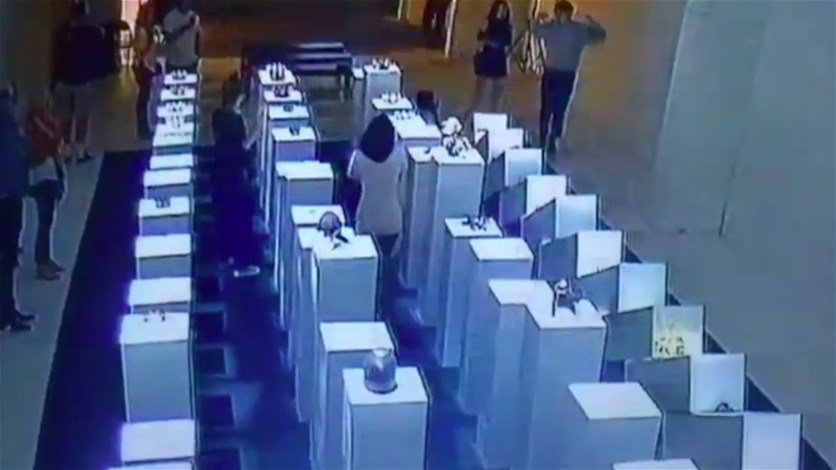 وتظهر السيدة في الفيديو وهي تتعثّر بعدما فقدت توازنها أثناء محاولة التقاط صورة سيلفي ما أدى إلى سقوط التماثيل خلفها على طريقة الدومينو.