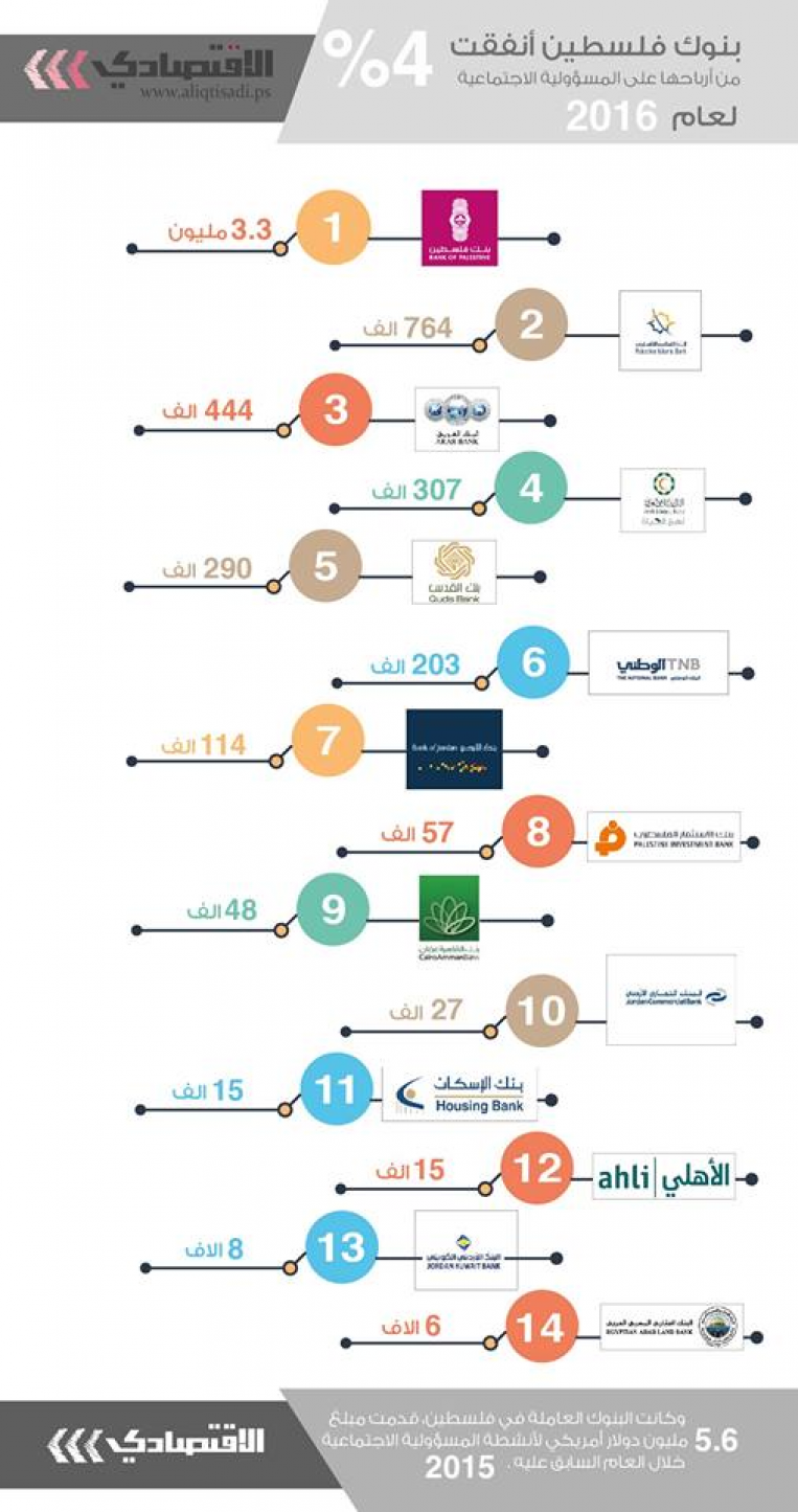وكانت البنوك العاملة في فلسطين، قدمت مبلغ 5.6 مليون دولار أمريكي لأنشطة المسؤولية الاجتماعية خلال العام السابق عليه 2015.