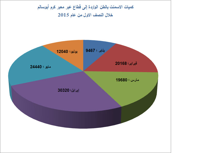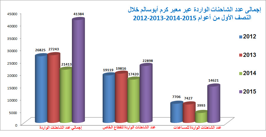 ومن خلال رصد حركة الشاحنات الواردة عبر معبر كرم أبو سالم خلال النصف الأول من عام 2015 , فقد بلغ عدد الشحنات الواردة خلال تلك الفترة 41384 شاحنة منها 22898 شاحنة للقطاع الخاص, و14621 شاحنة مساعدات إغاثية للمؤسسات الدولية العاملة بقطاع غزة وهي تشكل 35% من إجمالى الواردات, و بلغ متوسط عدد الشاحنات اليومية الواردة إلى قطاع غزة ( 230 ) شاحنة خلال تلك الفترة .