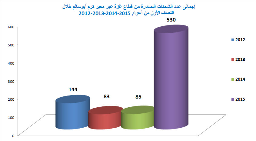 أما على صعيد الشاحنات الصادرة من قطاع غزة إلى العالم الخارجي والضفة الغربية وإسرائيل فقد بلغ عدد الشاحنات الصادرة خلال النصف الأول من عام 2015 حوالى 530 شاحنة من المنتجات الصناعية والزراعية بنسبة إرتفاع عن عام 2014 بحوالى 84% , ويأتي هذا الارتفاع بعد سماح إسرائيل بتسويق منتجات غزة الزراعية والصناعية بأسواق الضفة الغربية والأسواق الإسرائيلية, وبالرغم من ارتفاع نسبة الصادرات إلا أنها لم ترق للمطلوب , حيث بلغ معدل عدد الشاحنات الصادرة من قطاع غزة قبل فرض الحصار بما يزيد على 5000 شاحنة سنويا, ومازال المصدرون والمسوقون من قطاع غزة يواجهون العديد من المشاكل أثناء خروج بضائعهم من قطاع غزة، ومنها عدم توفر الإمكانيات في معبر كرم أبو سالم لخروج المنتجات الزراعية والصناعية إلى الخارج, تنزيل وتحميل البضائع لعدة مرات ما يؤثر على الجودة خصوصا في السلع الزراعية, وشروط إسرائيل بأن تتم عملية نقل البضائع إلى الضفة الغربية والخارج في شاحنات مغطاة ( ثلاجات) وألا يتجاوز ارتفاع الطلبية عن متر، هذا بالإضافة إلى مواصفات خاصة بالتغليف والتعبئة, ما يساهم في مضاعفة تكاليف النقل على التاجر وبالتالي على المستهلك.