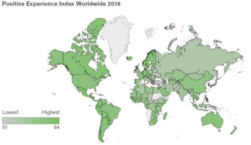 وقد حققت كلًا من أوكرانيا والعراق واليمن وتركيا أدنى مستويات للمشاعر الإيجابية، وكذلك دول الشرق الأوسط وشمال أفريقيا على الرغم أنه كان من بينهم ستة دول كان مستوى السعادة لديهم أعلى من المتوسط عام 2016.