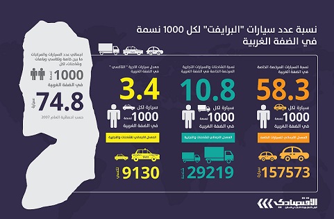 وبين تقرير سابق اعده الاقتصادي ان عدد السيارات " الخاصة- البرايفت " المرخصة في الضفة الغربية هو 157573 سيارة، من العدد الاجمالي لعدد السيارات المرخصة بشكل رسمي في سجلات وزارة النقل والمواصلات في الضفة الغربية لعام 2016، والذي وصل الى "202270 سيارة ".