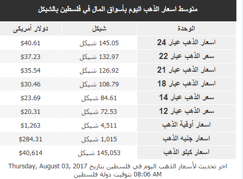 رام الله - الاقتصادي - جاء سعر غرام الذهب، اليوم الخميس، في الاسواق المحلية كما هو مبين في الصورة المرفقة:-