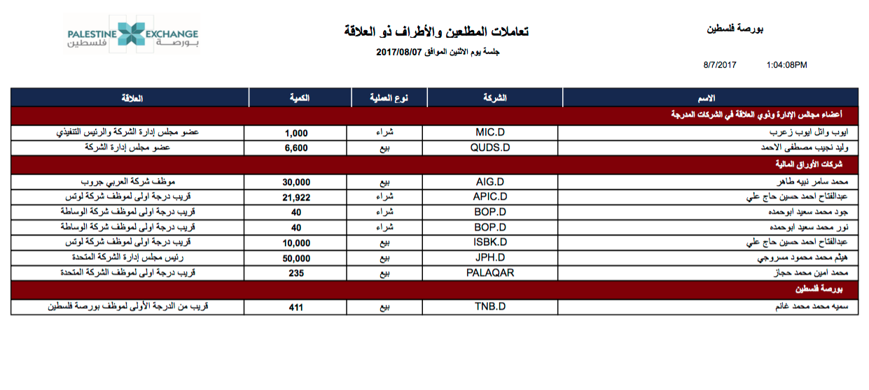 والأشخاص المطلعون بحسب بورصة فلسطين، هم الأشخاص الذين يطلعون على المعلومات الداخلية أو الأمور الجوهرية، بحكم وظائفهم وعملهم أو ملكيتهم أو علاقتهم بشكل مباشر أو غير مباشر بمن يحوز المعلومات.
