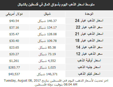 رام الله - الاقتصادي - جاء غرام سعر الذهب، في الاسواق المحلية، اليوم الثلاثاء، لعيارات 18.21.22.24 على النحو التالي:-
