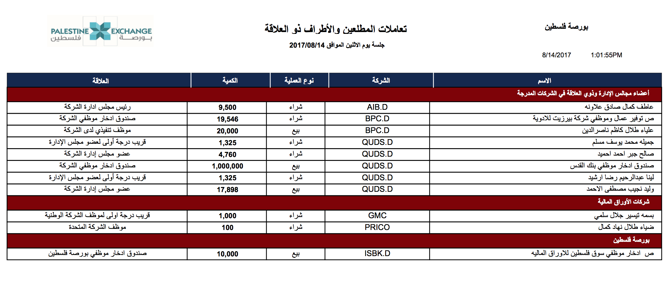 رام الله - متابعة الاقتصادي - بينت معطيات رسمية صادرة عن بورصة فلسطين، اليوم الإثنين، أن 11 صفقة تداول (بيع وشراء)، تمت من جانب أفراد أو مؤسسات مطلعة على أداء الشركات، أو ذات علاقة بها.