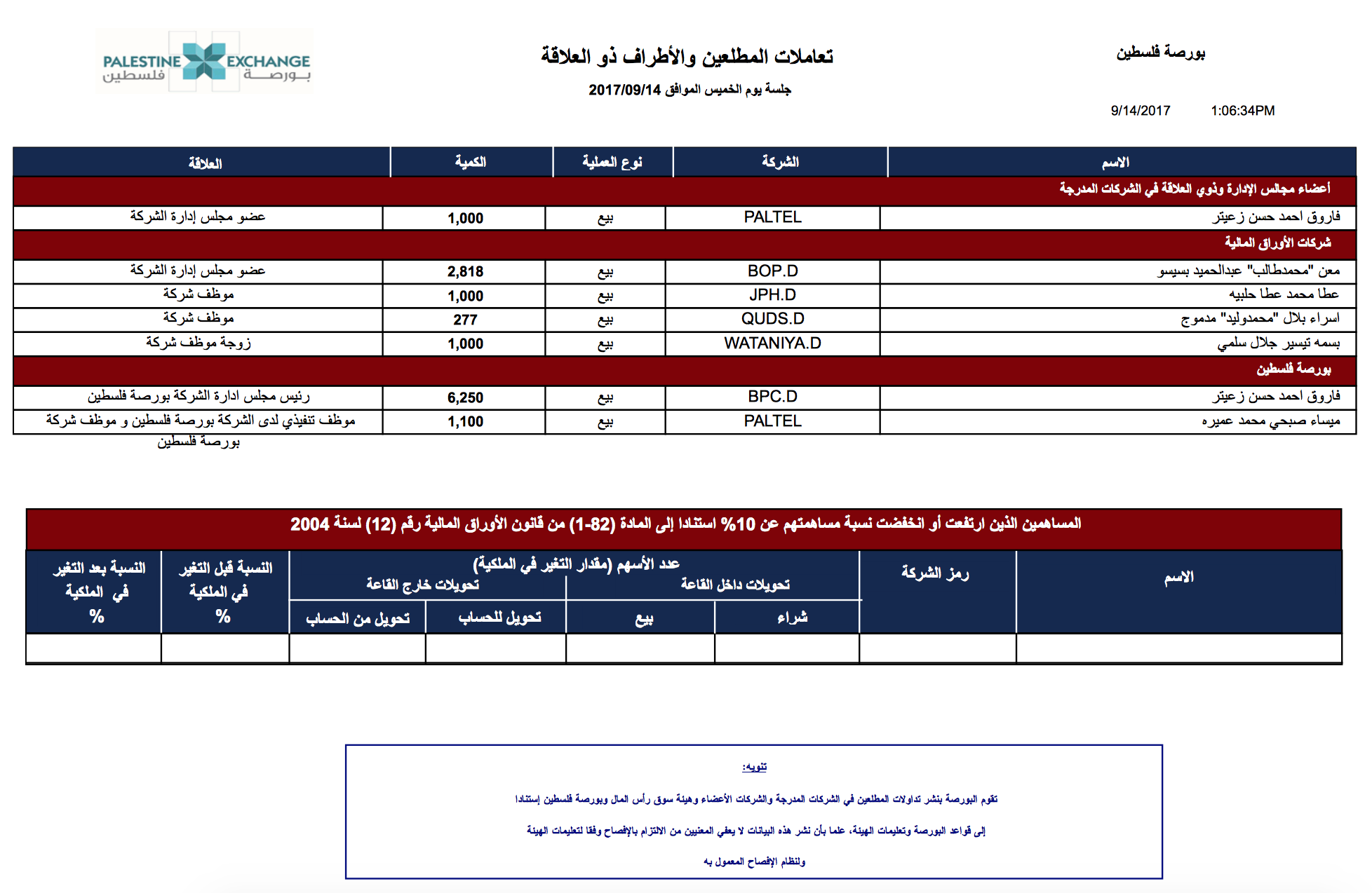 والأشخاص المطلعون بحسب بورصة فلسطين، هم الأشخاص الذين يطلعون على المعلومات الداخلية أو الأمور الجوهرية، بحكم وظائفهم وعملهم أو ملكيتهم أو علاقتهم بشكل مباشر أو غير مباشر بمن يحوز المعلومات.