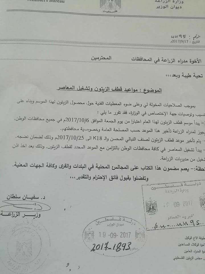 كما وجهت على البدء بعمل معاصر الزيتون مع البدء بقطف الثمار.