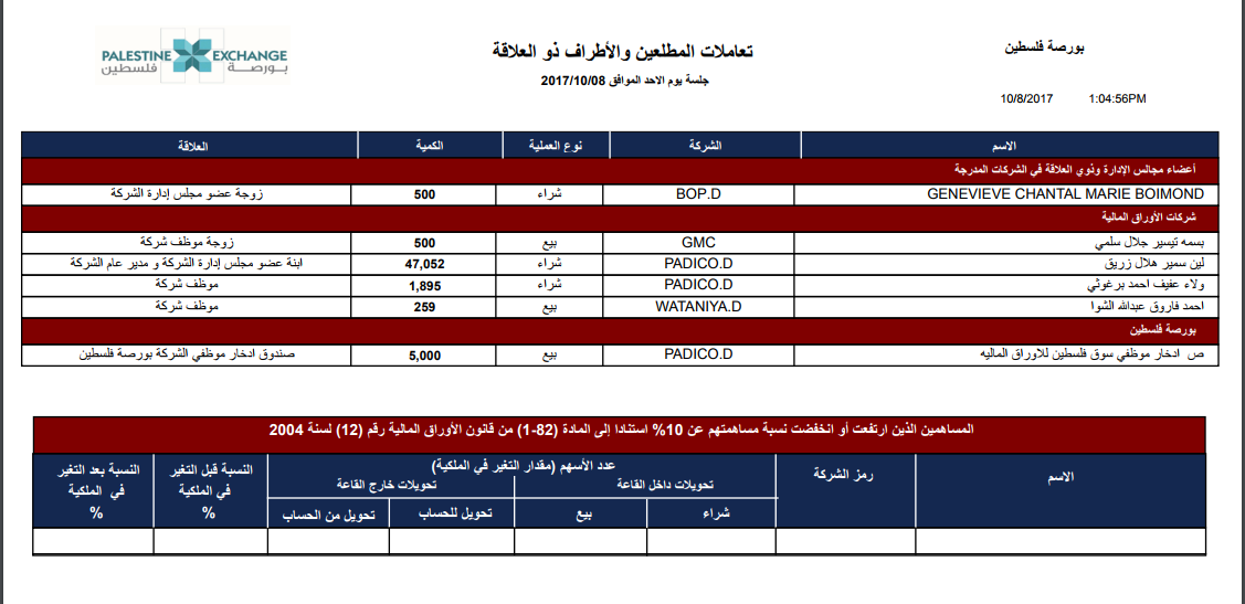إليك تداولات المطلعين في بورصة فلسطين اليوم الاحد