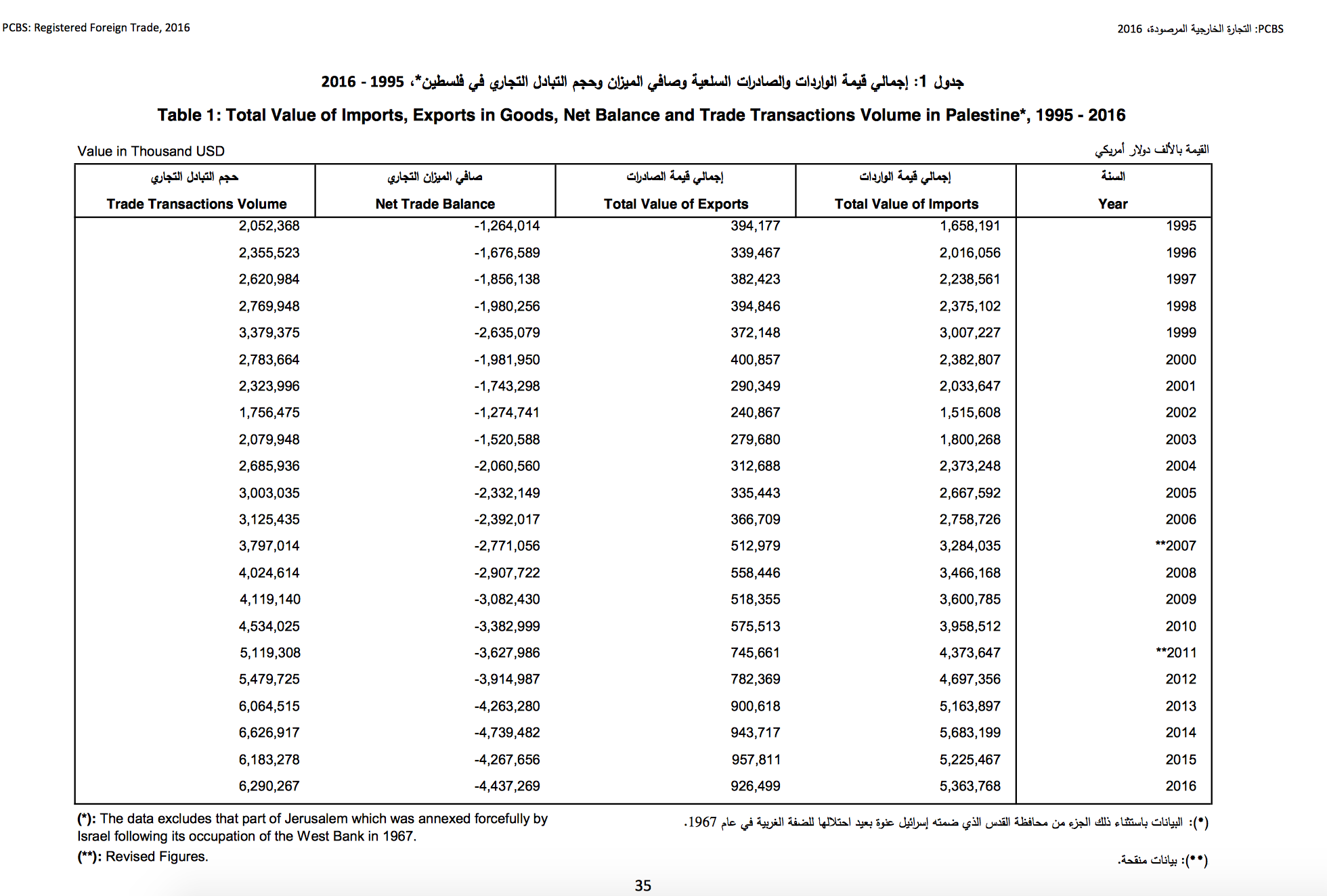 تقرير حديث صادر عن الإحصاء الفلسطيني، أن اعلى قيمة واردات في الفترة الواقعة ما بين (1995-2016)، جاءت في عام 2014، بحيث بلغت 5.683 مليار دولار امريكي.