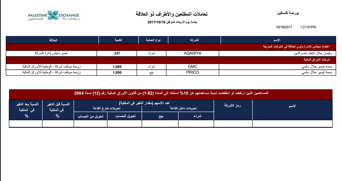 إليك تداولات المطلعين في بورصة فلسطين اليوم الاربعاء