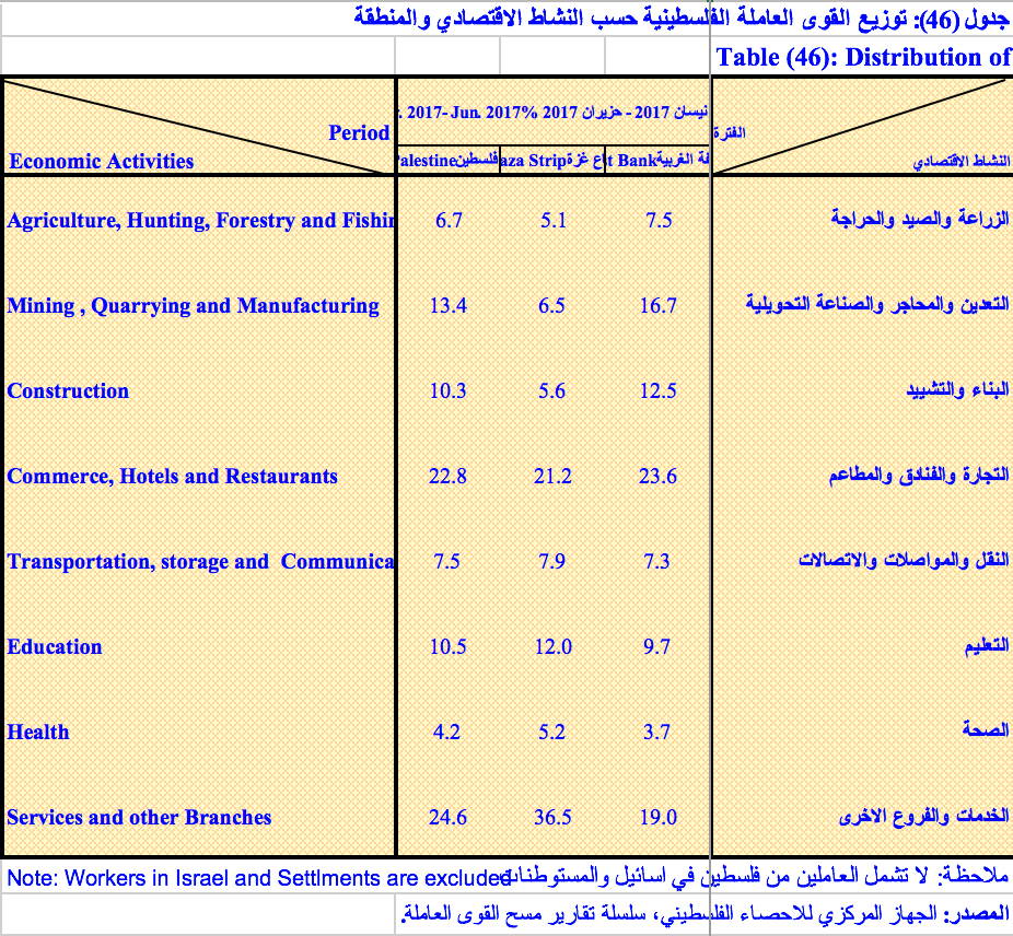 ولا يشمل توزيع العمال الفلسطينيين العاملين في الداخل المحتل والمستوطنات من حملة التصاريح أو الهوية الزرقاء، والذين وصل عددهم خلال الربع الثاني من عام 2017، إلى 128,400 ألف عامل، يضاف إليهم عمال يعملون دون تصاريح، وفلسطينيون يحملون تصاريح تجار واحتياجات خاصة لأغراض العمل.