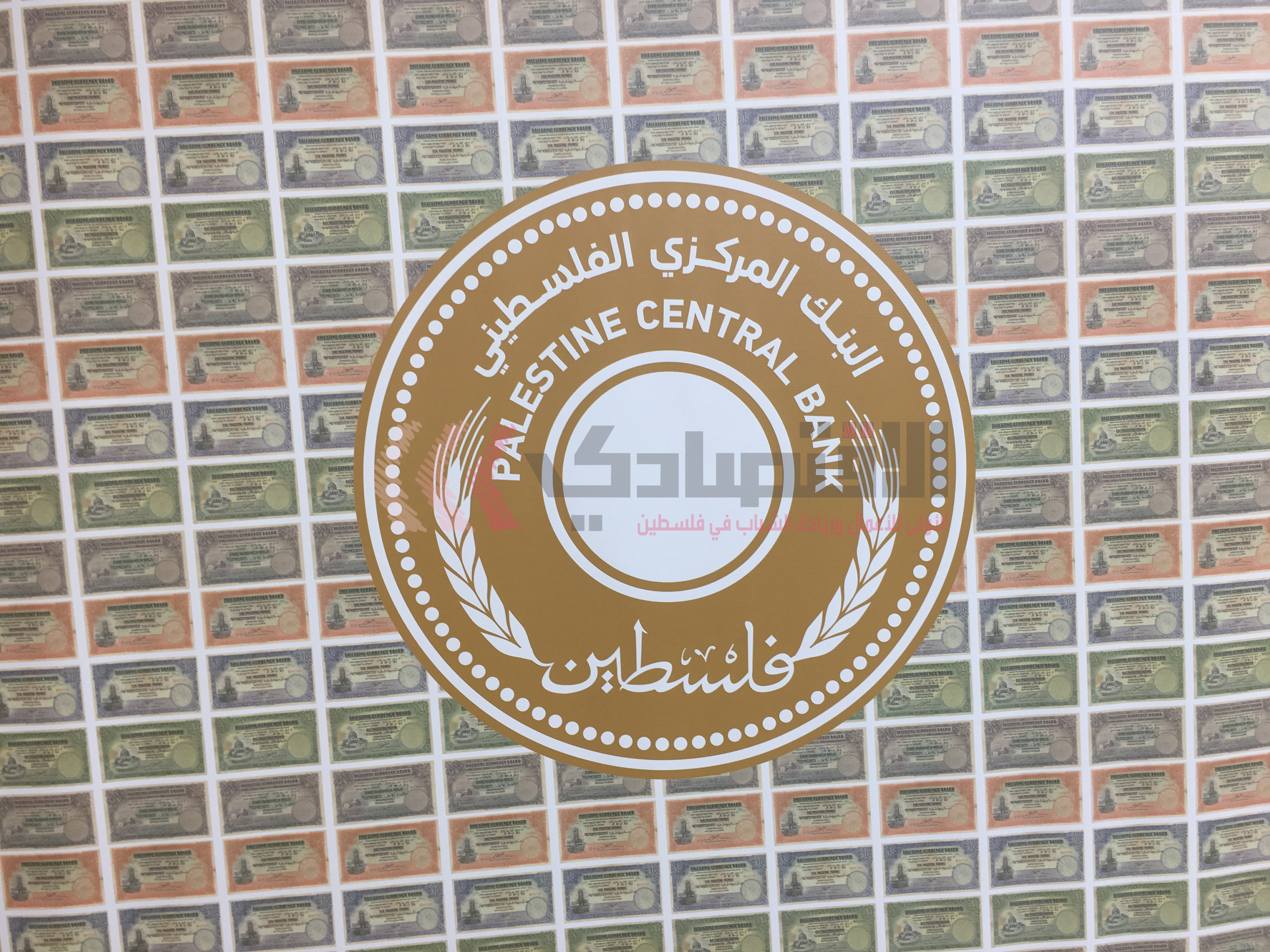 رام الله - خاص الاقتصادي - على واجهة قاعة استقبل فيها إداريو سلطة النقد الفلسطينية، صحفيين عاملين في وسائل إعلام فلسطينية وعربية، يتعلق شعار "البنك المركزي الفلسطيني" المرتقب.