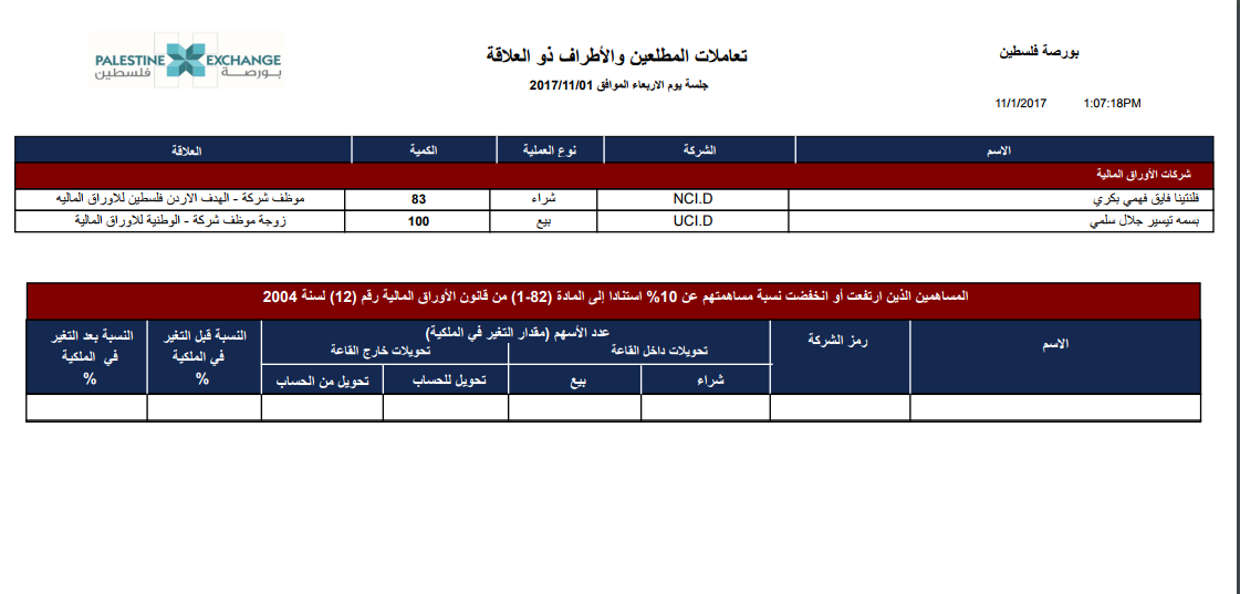رام الله - متابعة الاقتصادي - بينت معطيات رسمية صادرة عن بورصة فلسطين، اليوم الاربعاء، أن صفقتان تداول (بيع وشراء)، تمت من جانب أفراد أو مؤسسات مطلعة على أداء الشركات، أو ذات علاقة بها.