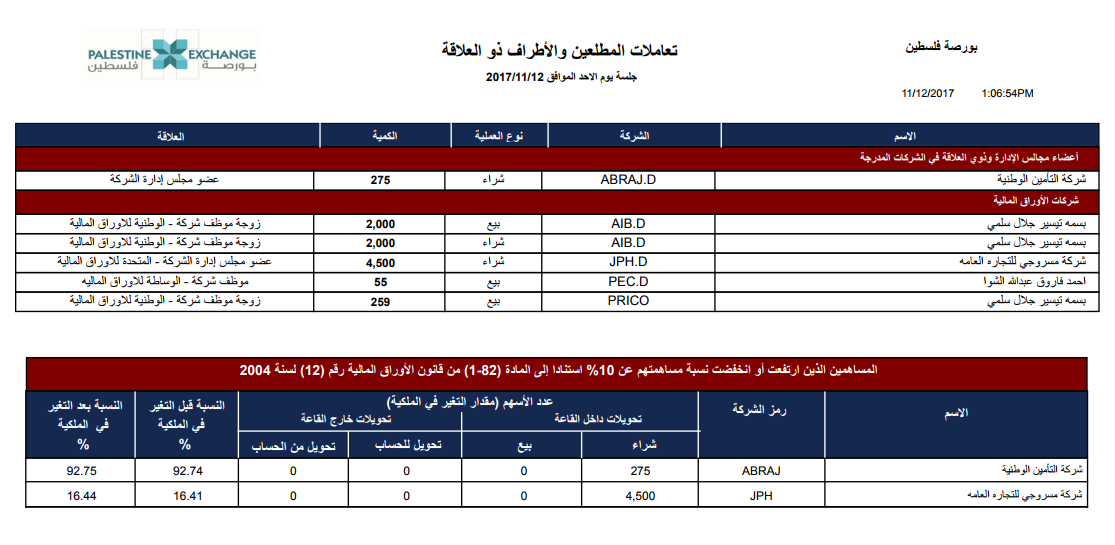 إليك تداولات المطلعين في بورصة فلسطين اليوم الاحد