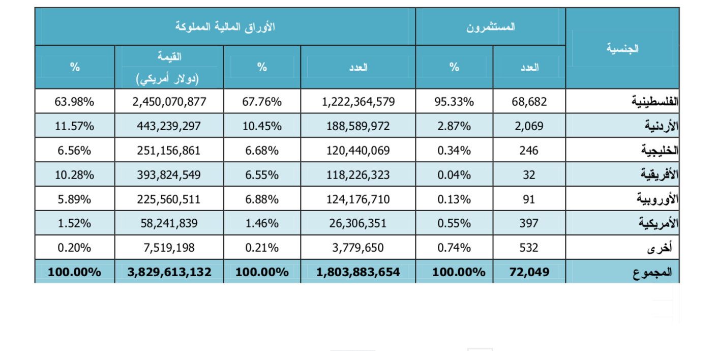 وتستحوذ الجنسية الفلسطينية على عدد المستثمرين وملكيتهم للأوراق المالية، بـ 68.682 ألف مستثمر، تشكل نسبتهم 95% من إجمالي عدد المستثمرين في الأسهم المدرجة ببورصة فلسطين.