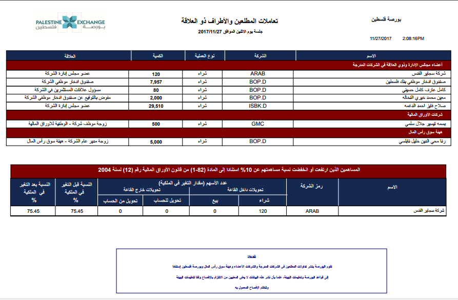 رام الله - متابعة الاقتصادي - بينت معطيات رسمية صادرة عن بورصة فلسطين، اليوم الاثنين، أن 7 صفقات تداول (بيع وشراء)، تمت من جانب أفراد أو مؤسسات مطلعة على أداء الشركات، أو ذات علاقة بها.