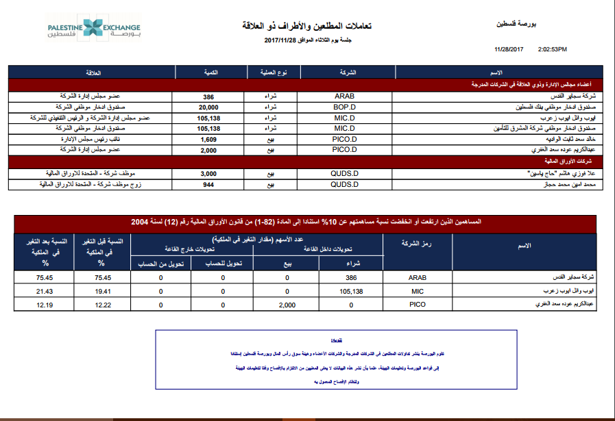 رام الله - متابعة الاقتصادي - بينت معطيات رسمية صادرة عن بورصة فلسطين، اليوم الثلاثاء، أن 8 صفقات تداول (بيع وشراء)، تمت من جانب أفراد أو مؤسسات مطلعة على أداء الشركات، أو ذات علاقة بها.