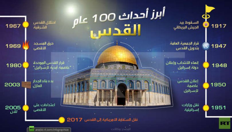 الاقتصادي - (روسيا اليوم) - تعد القدس واحدة من أقدم مدن العالم، نقدم لكم تسلسل زمني لأهم وأبرز الأحداث في الـ 100 عام الأخيرة..