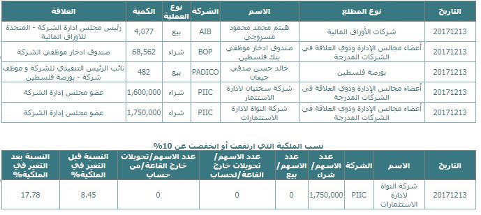 رام الله - متابعة الاقتصادي - بينت معطيات رسمية صادرة عن بورصة فلسطين، اليوم الأربعاء، أن 5 صفقات تداول (بيع وشراء)، تمت من جانب أفراد أو مؤسسات مطلعة على أداء الشركات، أو ذات علاقة بها.