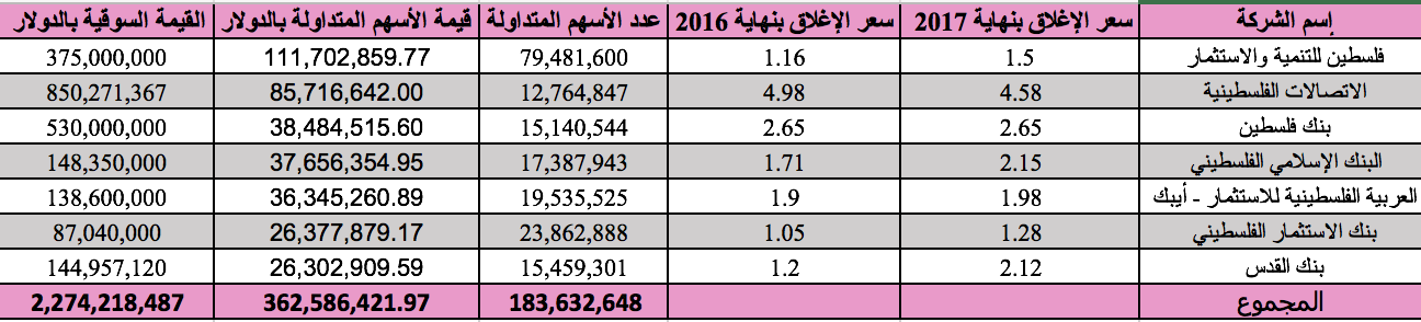 وبلغ إجمالي القيمة السوقية للشركات السبع، 2.274 مليار دولار، أكبرها شركة الاتصالات الفلسطينية بـ 850 مليون دولار أمريكي.