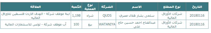 رام الله - متابعة الاقتصادي - بينت معطيات رسمية صادرة عن بورصة فلسطين، اليوم الثلاثاء، أن صفقتين تداول (بيع وشراء)، تمت من جانب أفراد أو مؤسسات مطلعة على أداء الشركات، أو ذات علاقة بها.